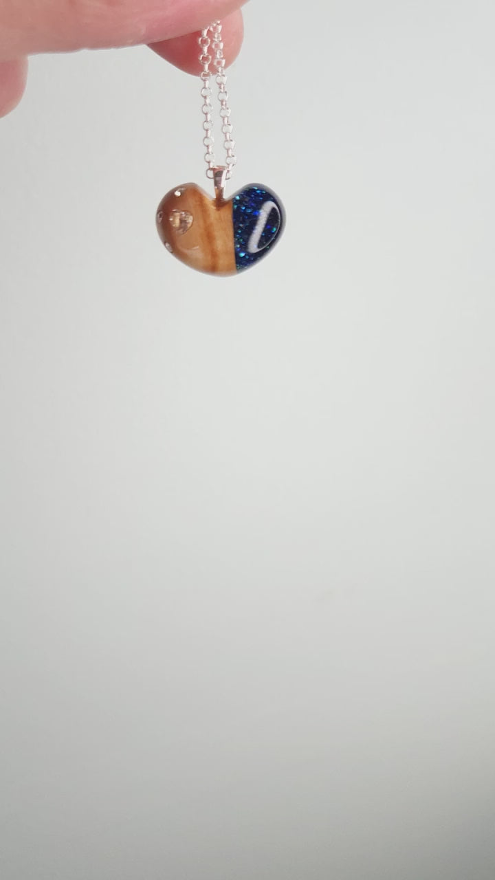 Pendentif coeur en bois + résine poussière de diamants + poussière de cendre